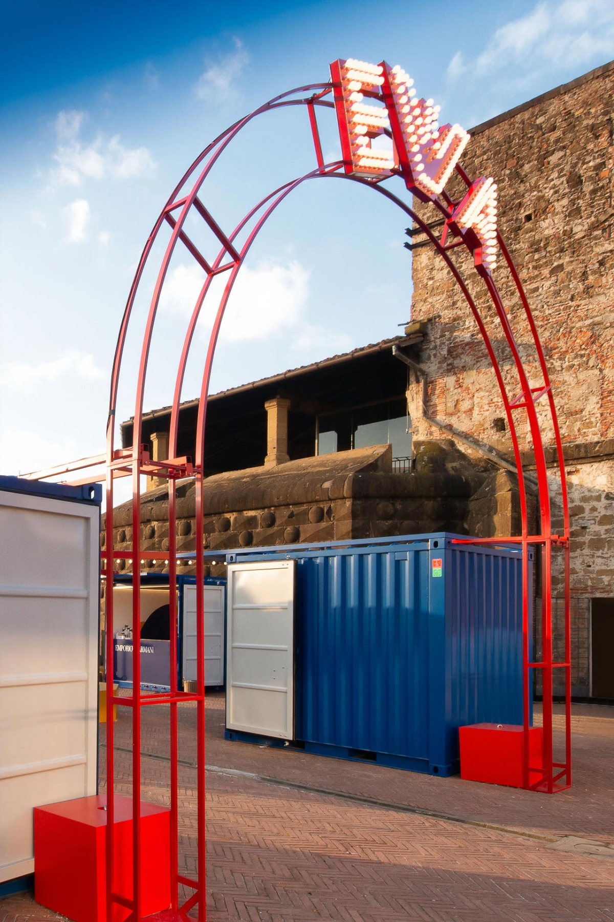 A real amusement park was set up outside the fencing room, while inside the real exhibition took place. The settings included two rows of polycarbonate panels, video walls and neon lights to recall the street style idea of the brand.