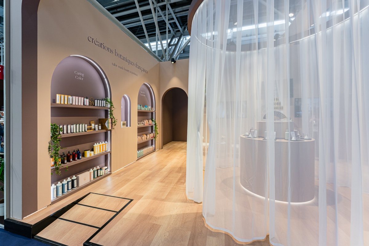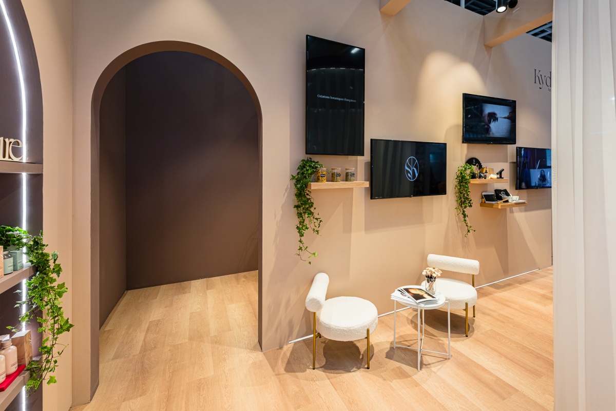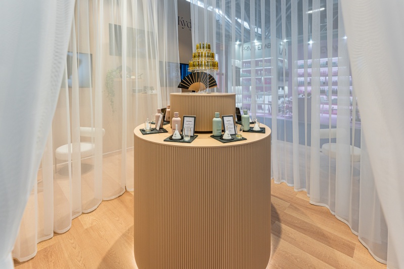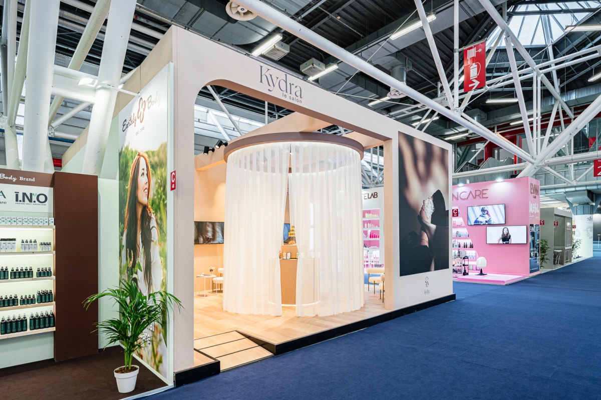 Barberini realizza lo spazio espositivo per il brand Kydra, a Cosmoprof 2025, uno stand perfetto per evocare eleganza e raffinatezza, grazie ai toni del cipria, colori caldi e delicati.