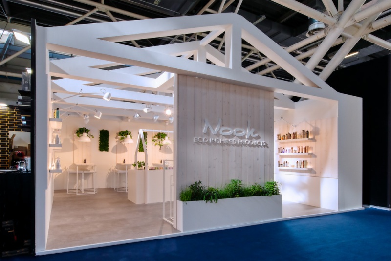 Un piccolo spazio dal design eco chic, lo stand di Nook è una casetta total white in legno naturale e tocchi green.