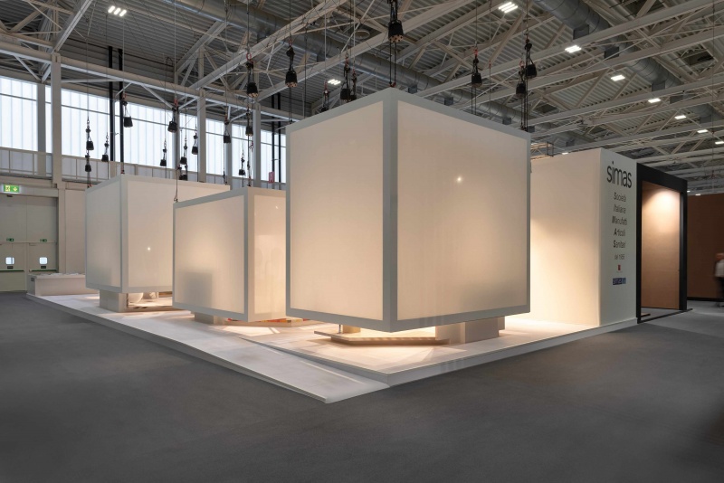 For Cersaie 2025, Barberini created the Simas exhibition space designed by Architect Giancarlo Angelelli, giving shape to a project that celebrates the company's seventieth anniversary through a language of lightness and abstraction.