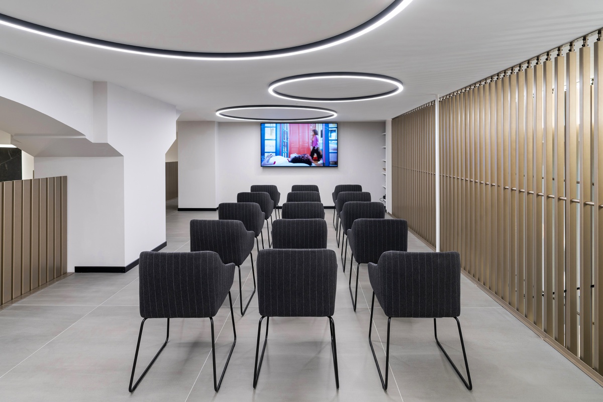 Sempre al piano terra troviamo un’area lounge e la materioteca, oltre che l'imponente scala che conduce al piano mezzanino, dove sono presenti gli uffici operativi e uno space cinema adibito anche a spazio di conversazione.