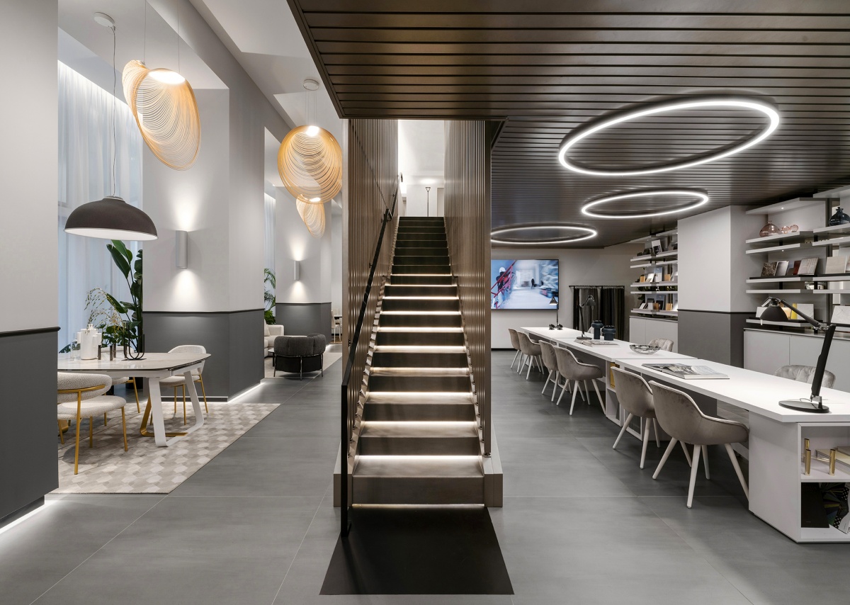 Il progetto, firmato dal prestigioso studio di architettura milanese, Studio Marco Piva, è uno spazio espositivo di 700 mq, che per la prima volta raggruppa tre brand del omonimo gruppo Fiuliano: Ditre, Luce Plan e Calligaris.