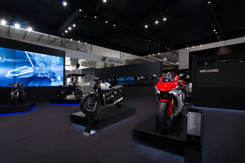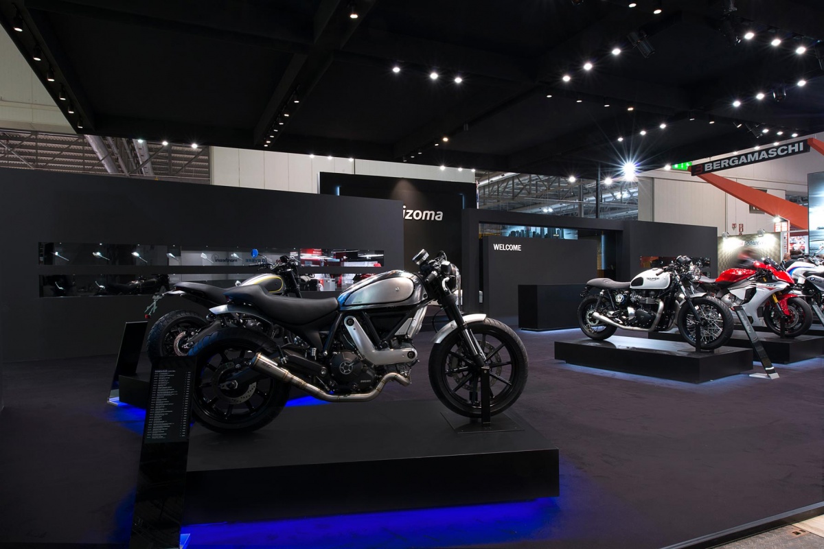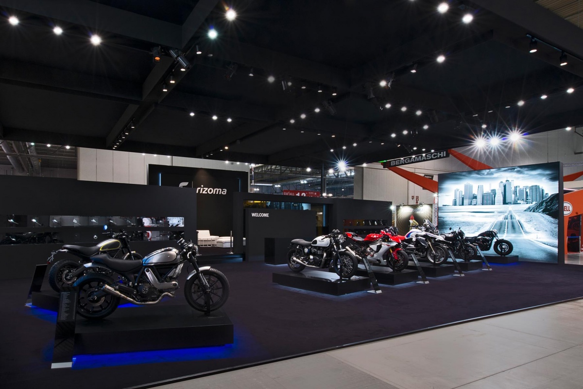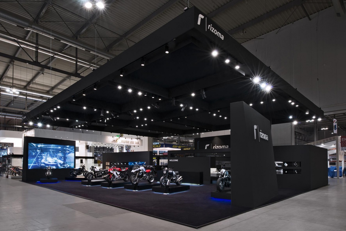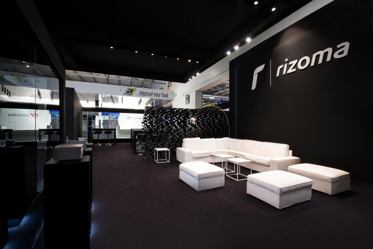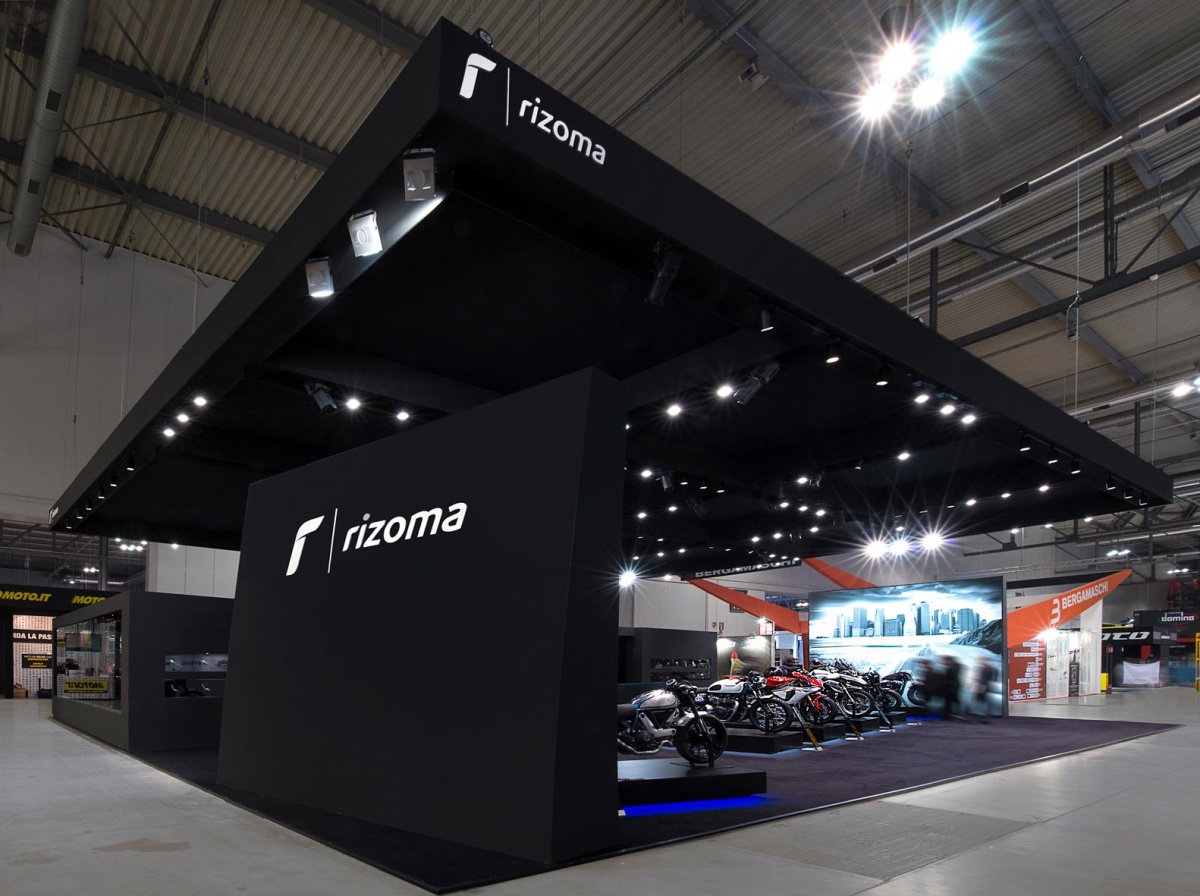 Per la loro partecipazione a Eicma, Rizoma sceglie un progetto dal design “total black” e da un mood minimal firmato dall’architetto Riccardo Bianchi. Per l’azienda varesotta è stato concepito un ampio spazio dedicato ai prodotti e alla comunicazione del brand attraverso l’impiego della tecnologia multimediale e di un progetto illuminotecnico pensati per valorizzare la qualità della produzione Rizoma.